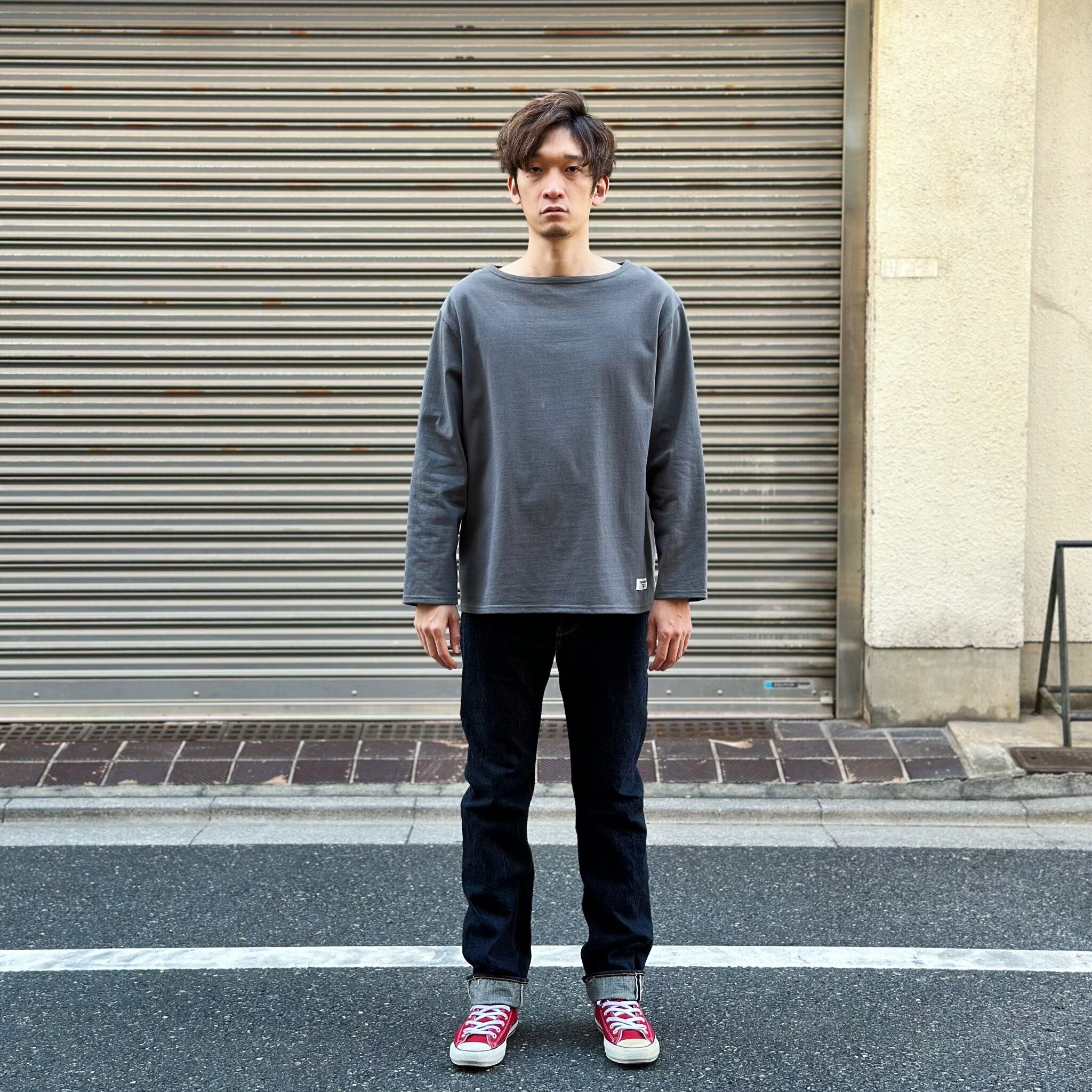 極太の空紡糸、ヘビーウェイト生地を使用したボートネックのロングスリーブTシャツ。