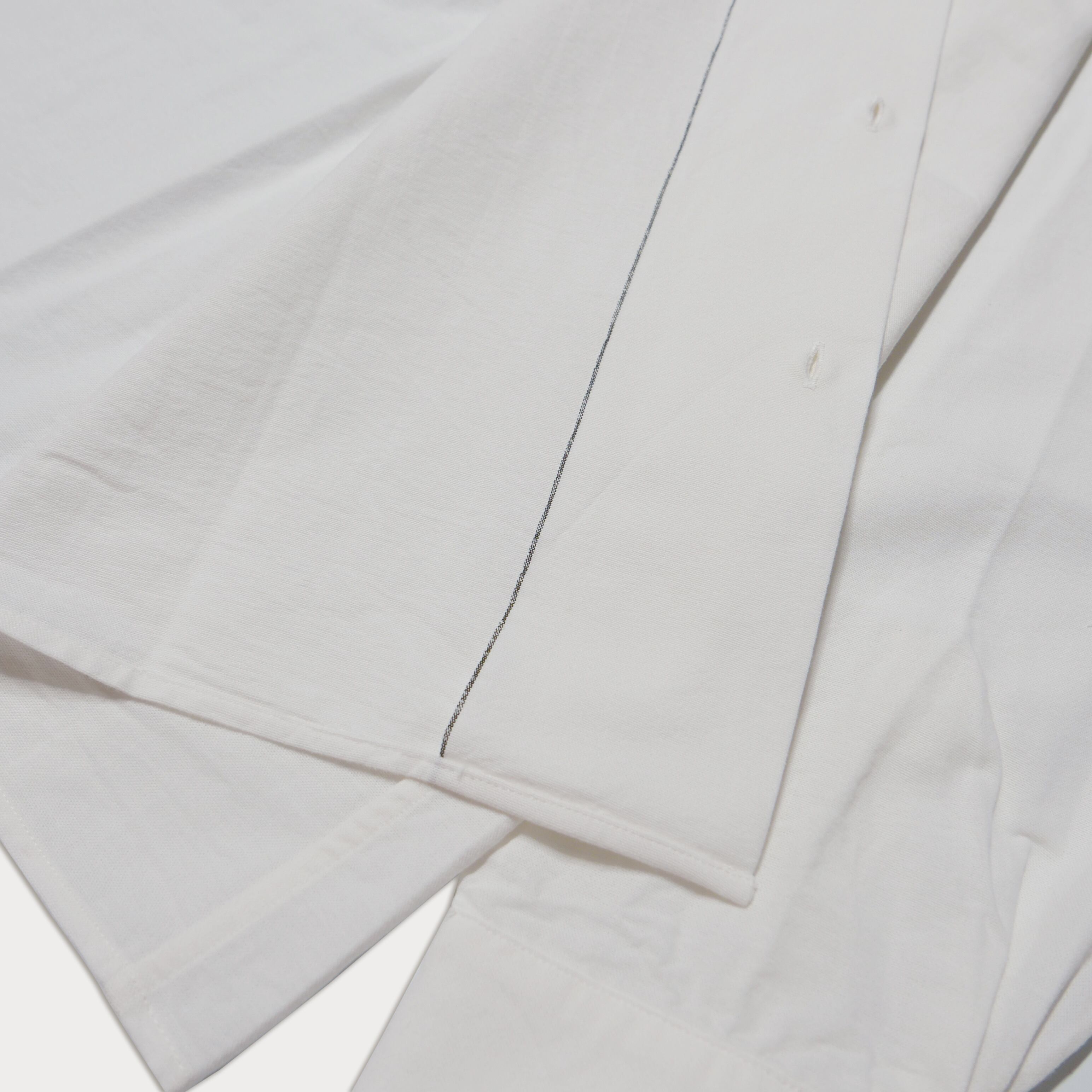 この生地は、ヴィンテージのシャトル織機で丁寧に織り上げられており、洗うたびに織り目が締まり、着用を重ねるごとに肌にしっくりと馴染んでいくのが特徴です。