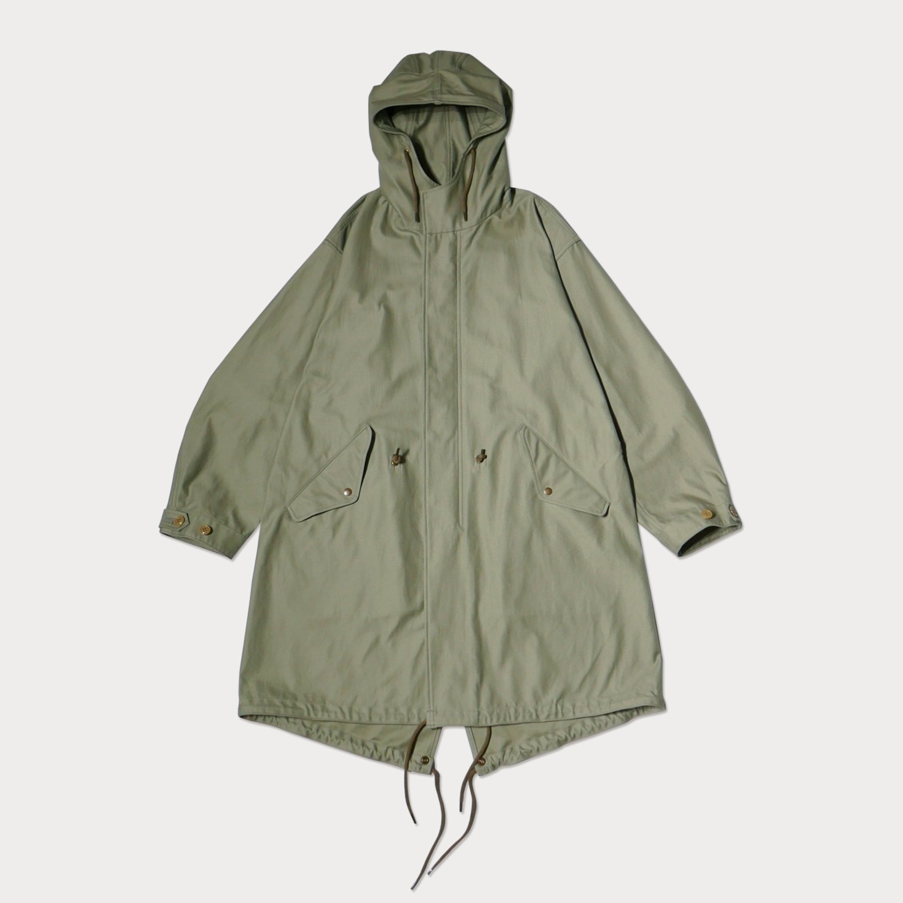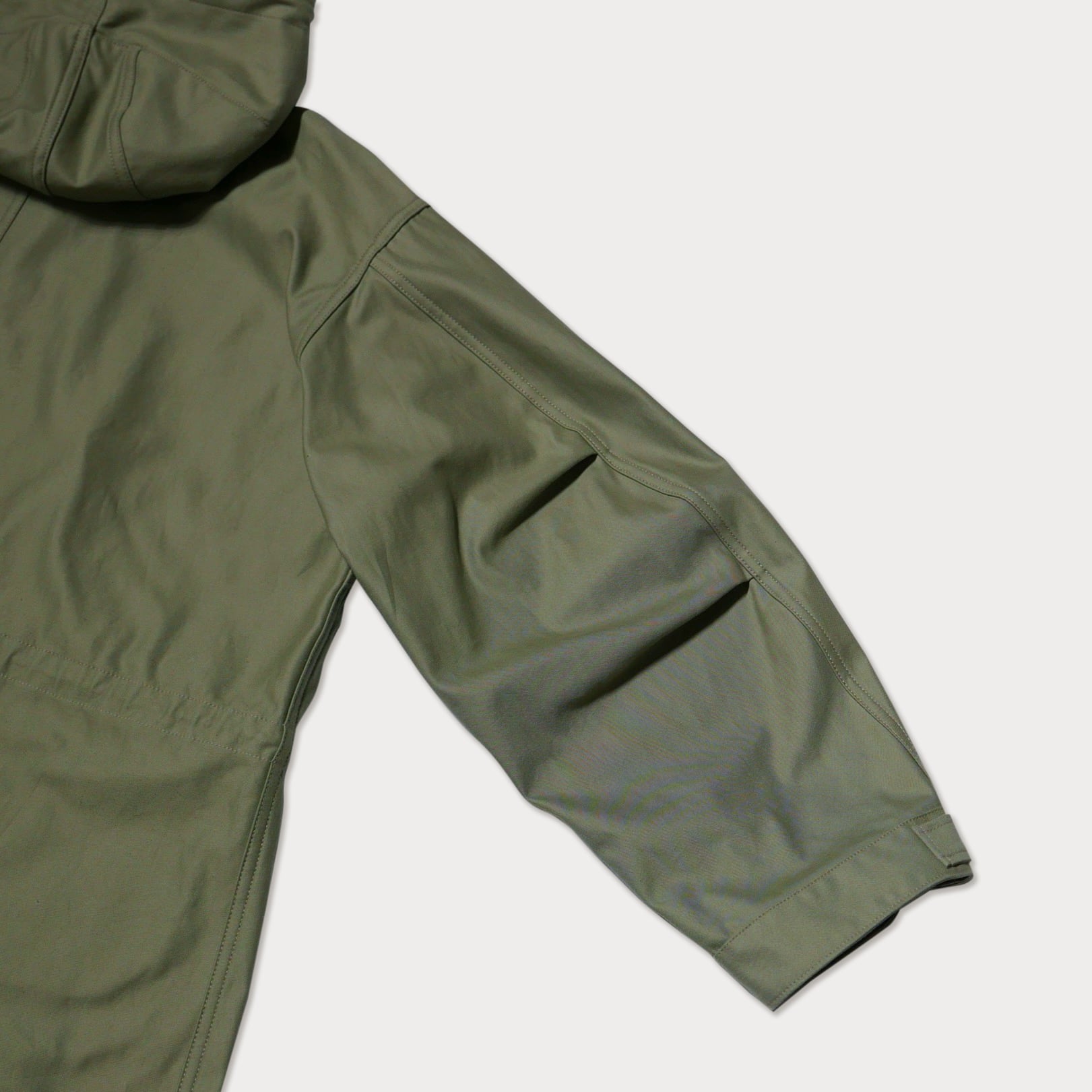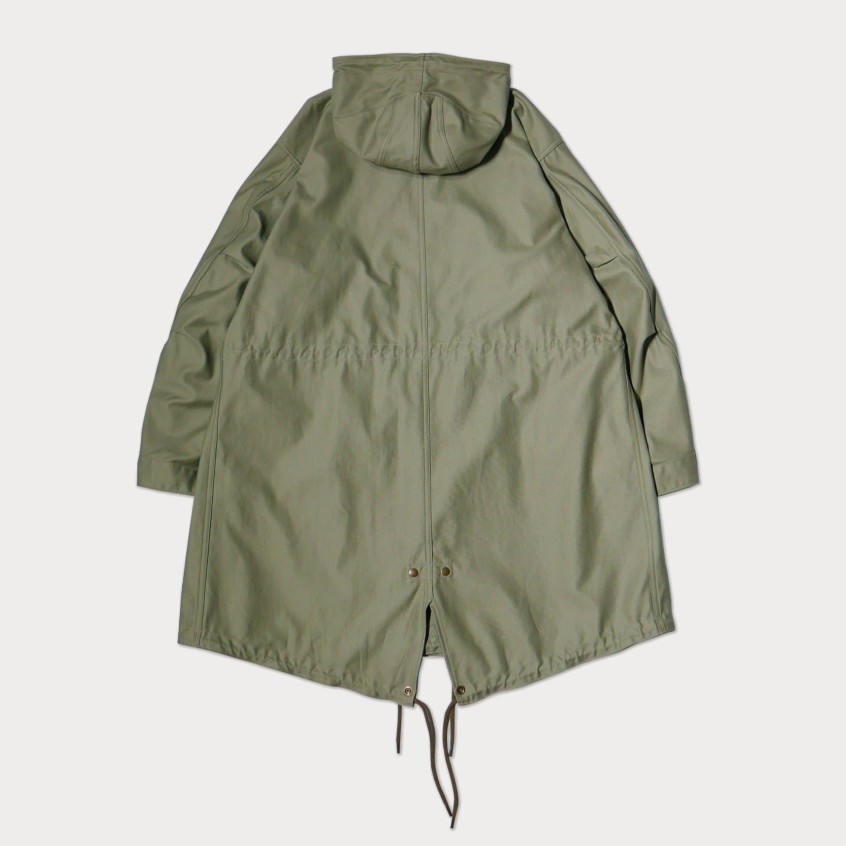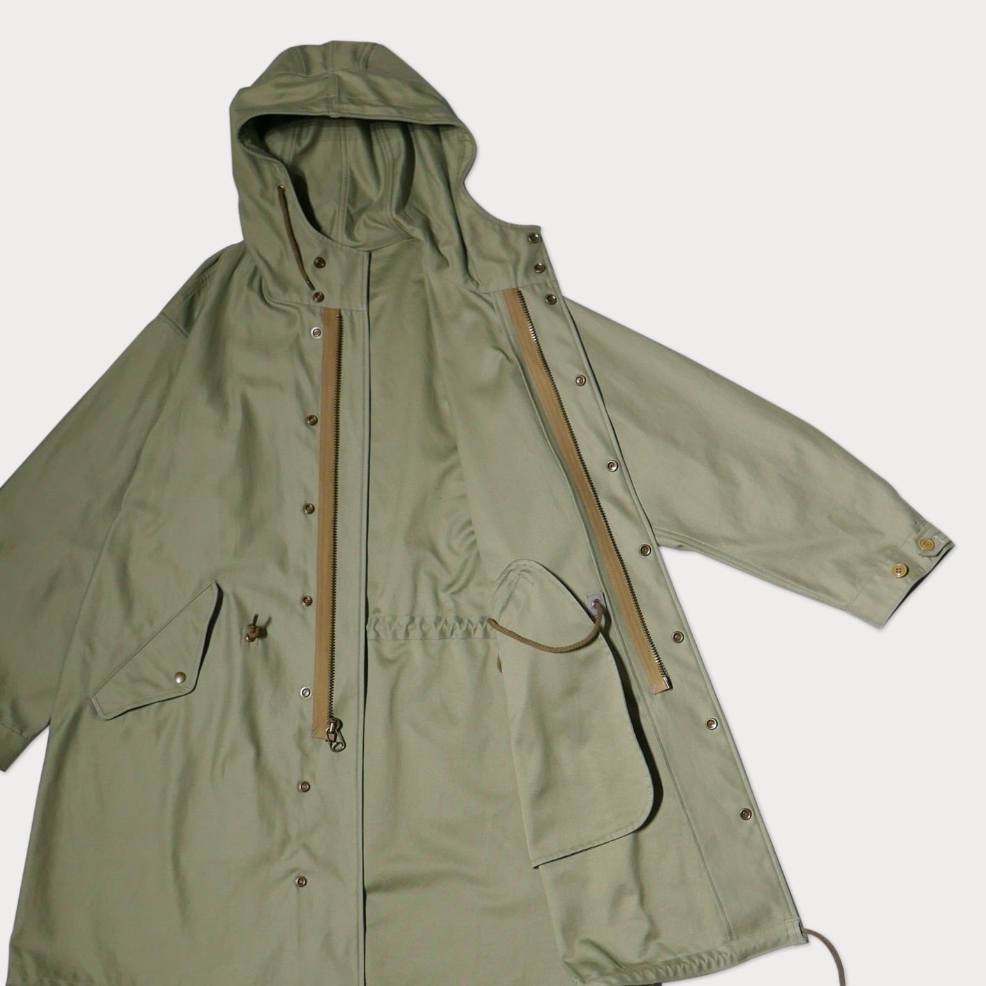 セージグリーンのバックサテン生地で仕立てた、クラシックなミリタリーパーカーを洗練されたデザインに仕上げた一着です。