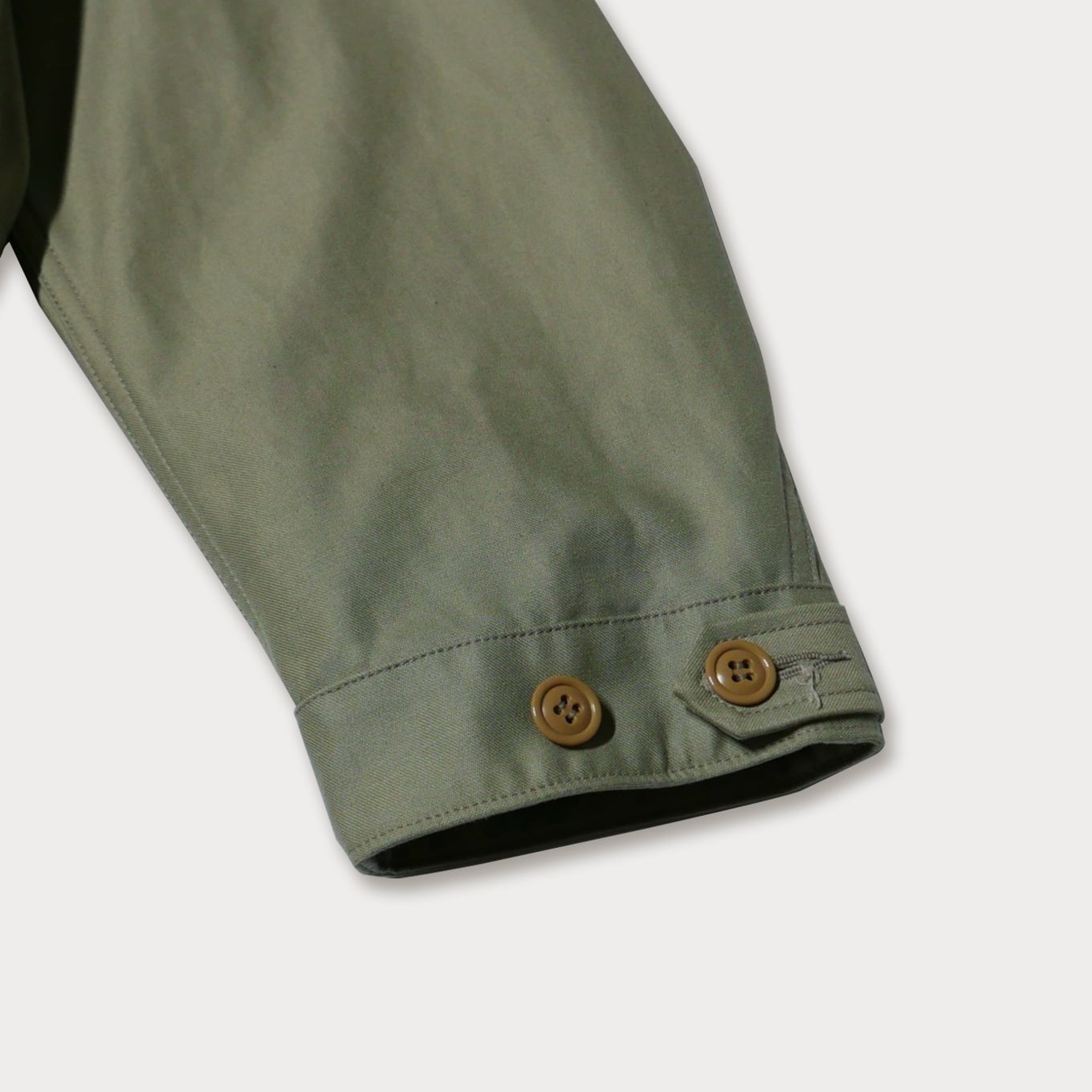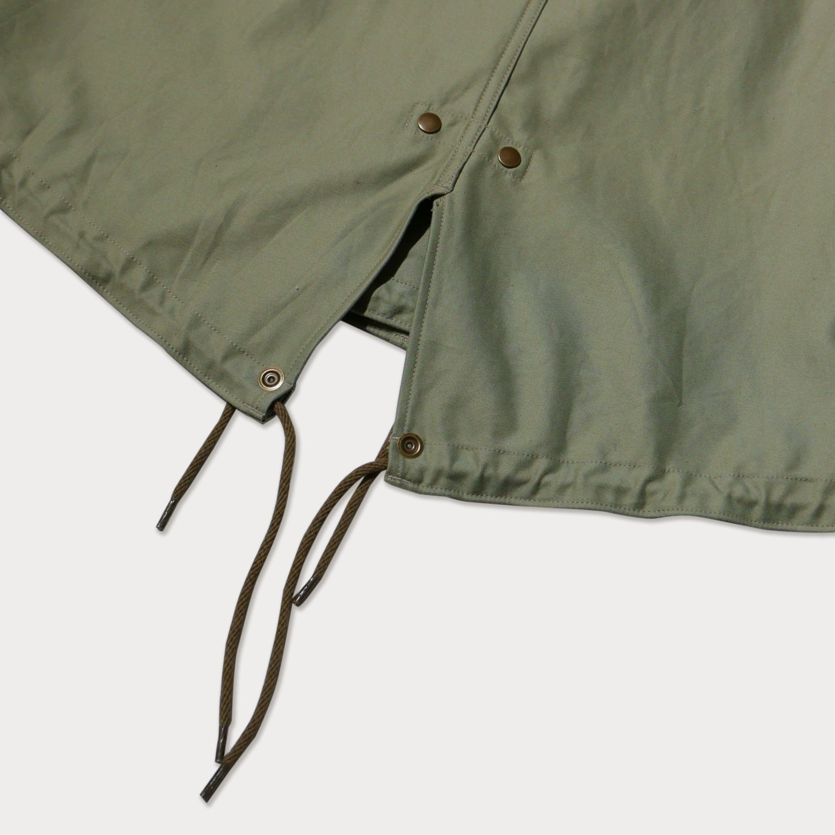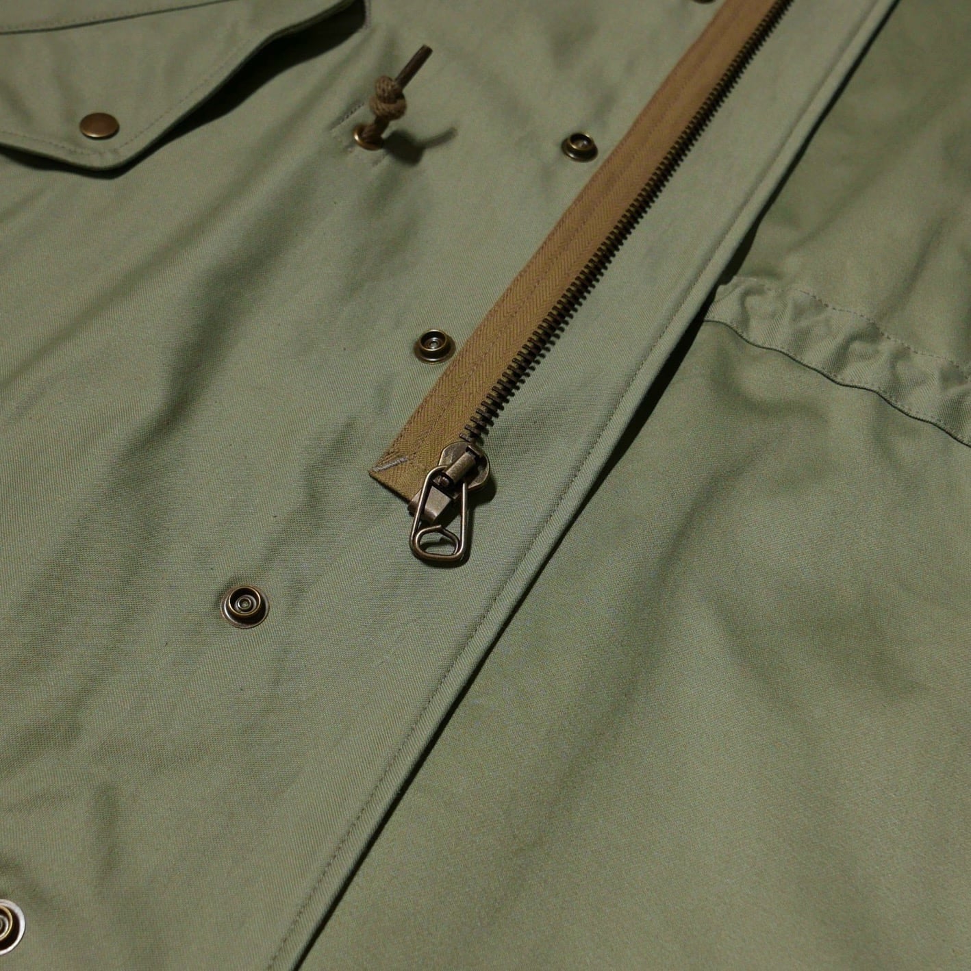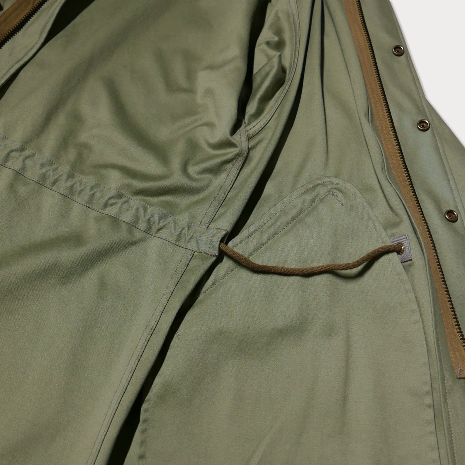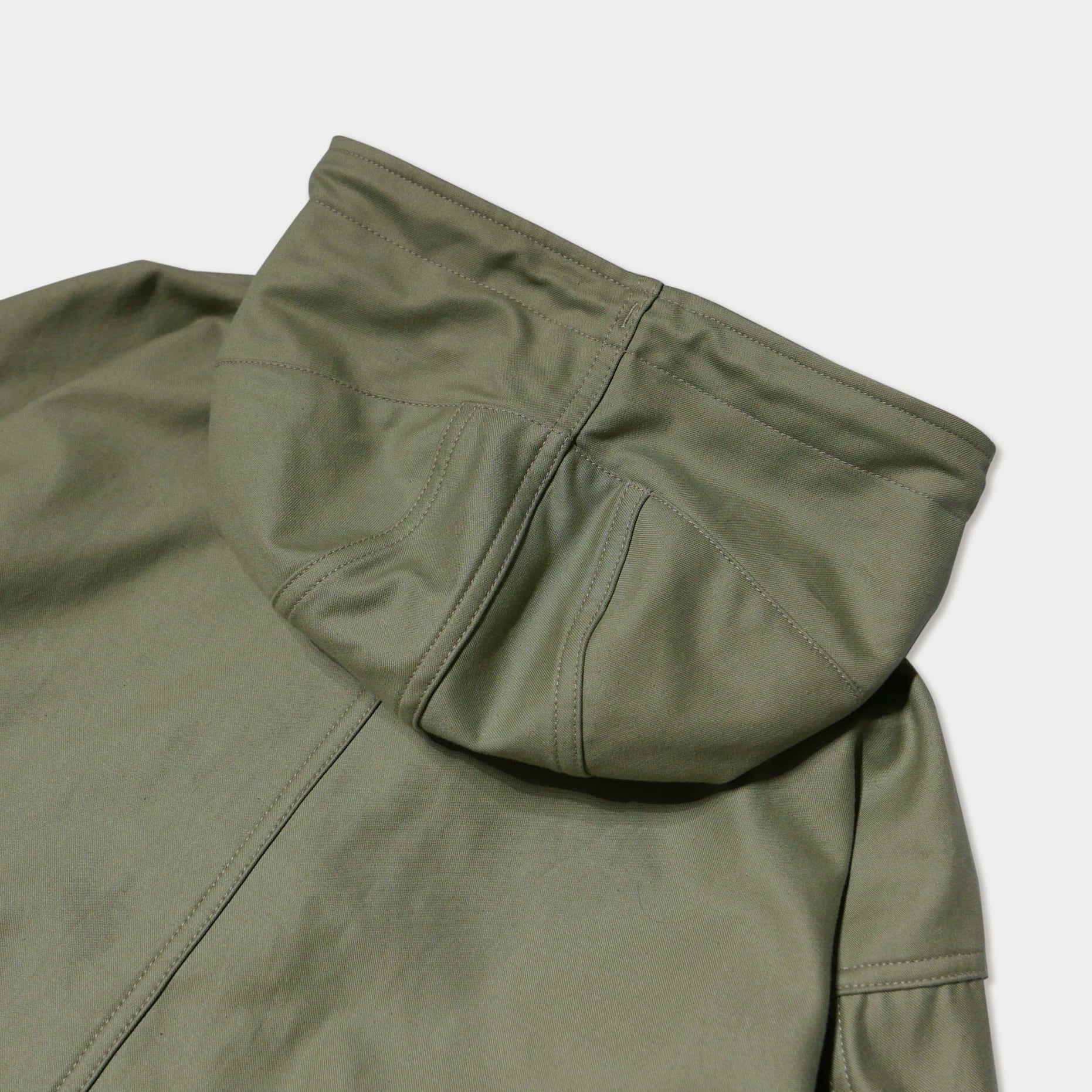 セージグリーンのバックサテン生地で仕立てた、クラシックなミリタリーパーカーを洗練されたデザインに仕上げた一着です。