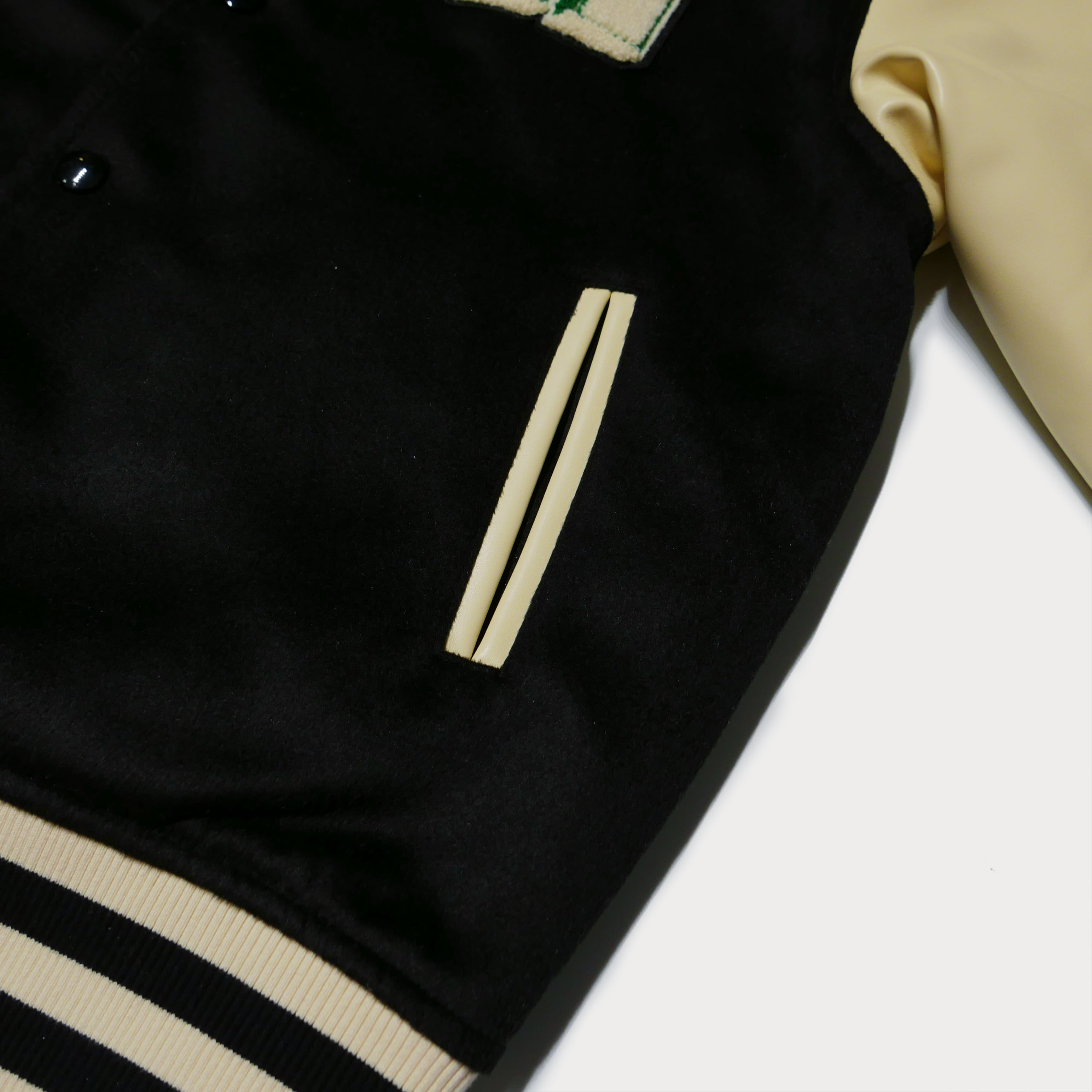 袖部分には滑らかな合皮を使用し、ブラックとクリームの配色がスタイリッシュな印象を与えます。