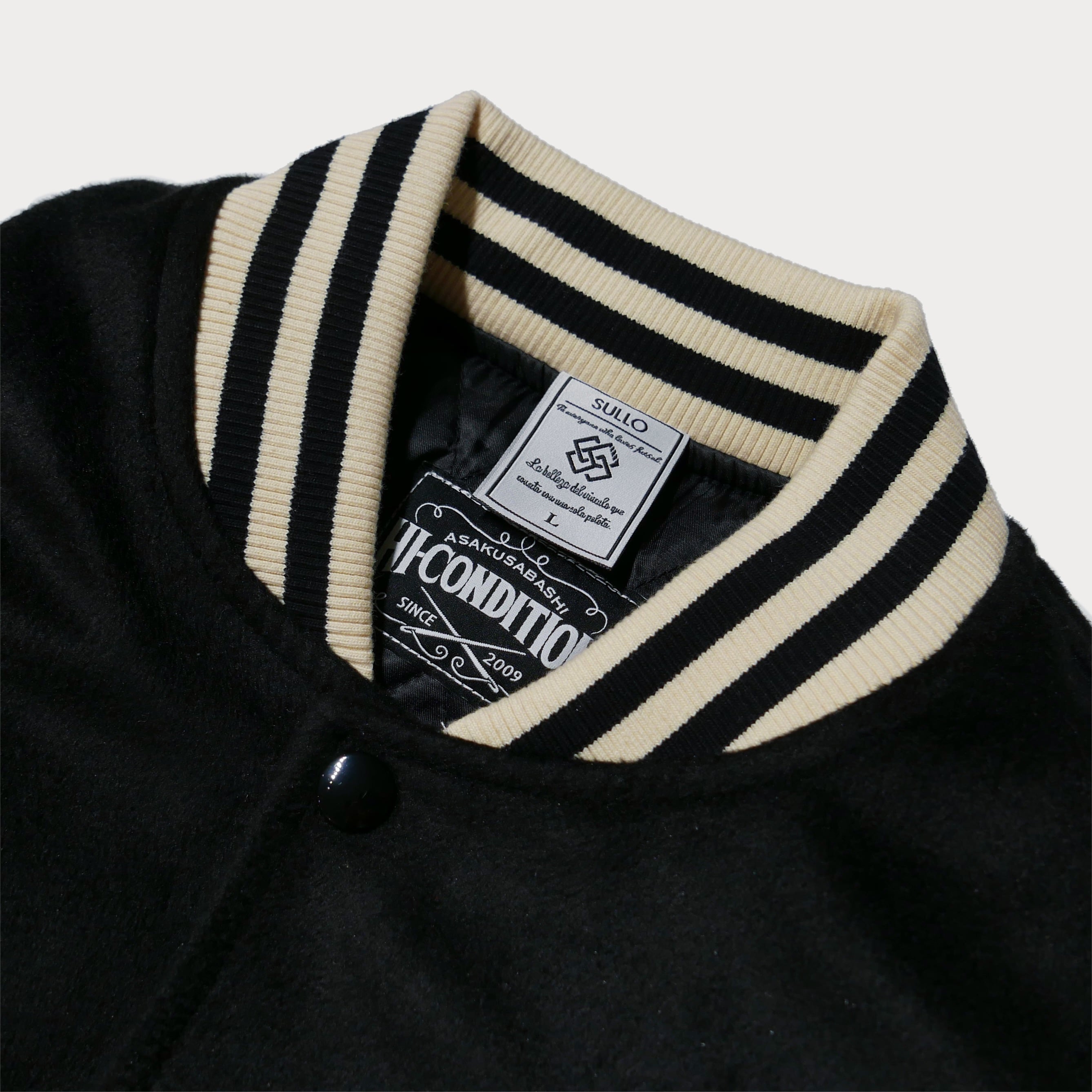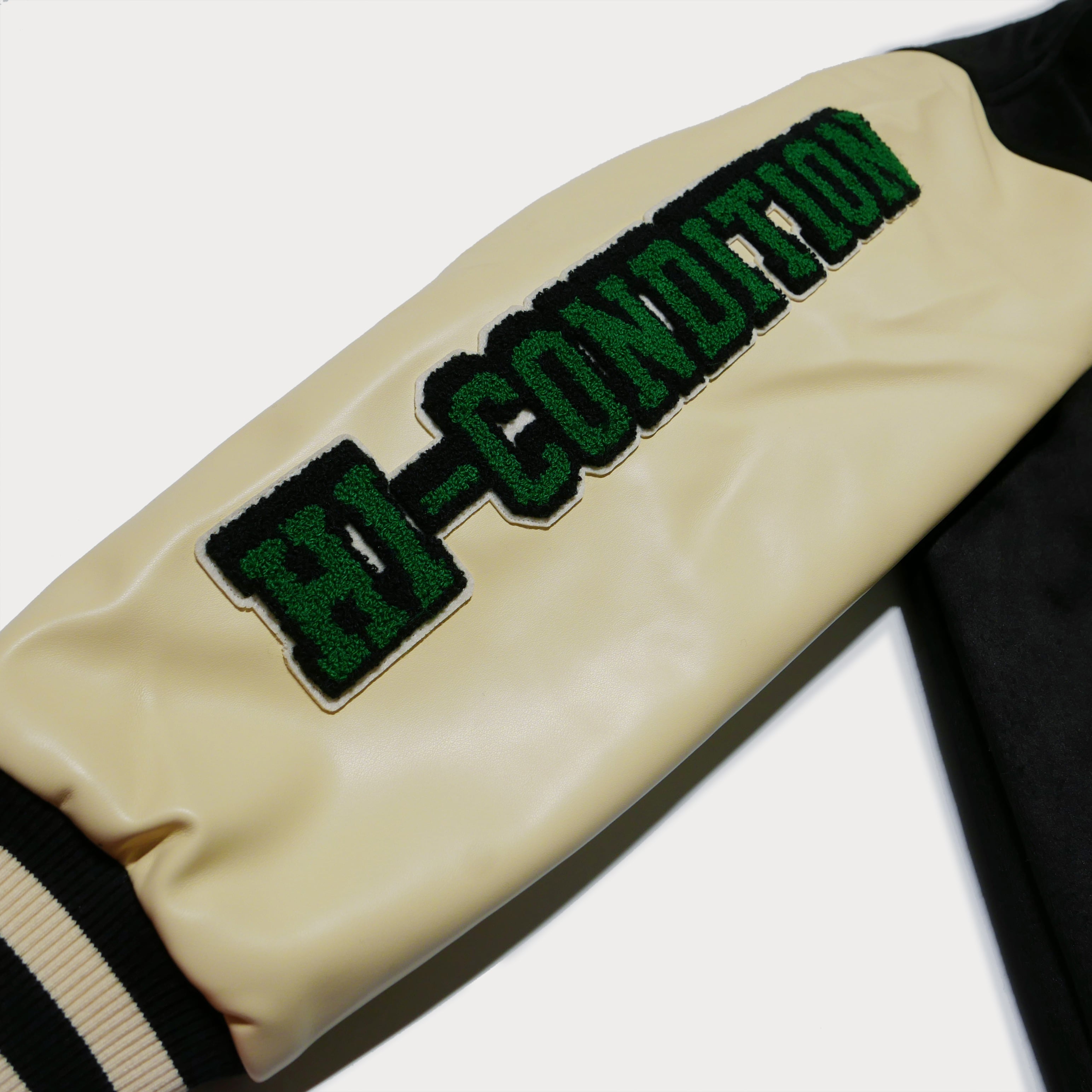 胸元と袖には大胆なパッチデザインを施し、ブランドの個性をしっかりとアピール。袖に配置された「HI-CONDITION」の刺繍は細部まで丁寧に仕上げられ、ヴィンテージ感と高級感を演出します。